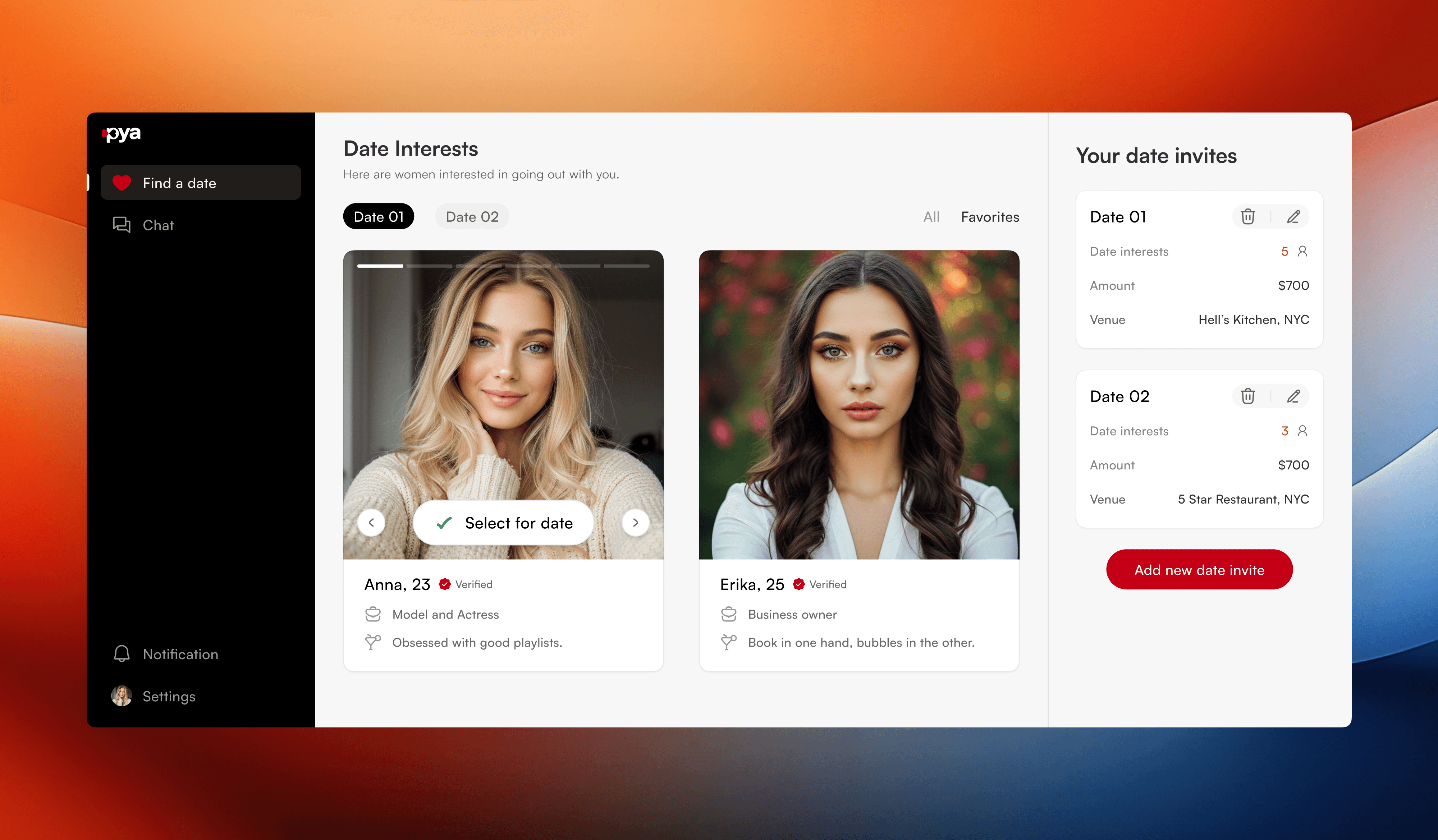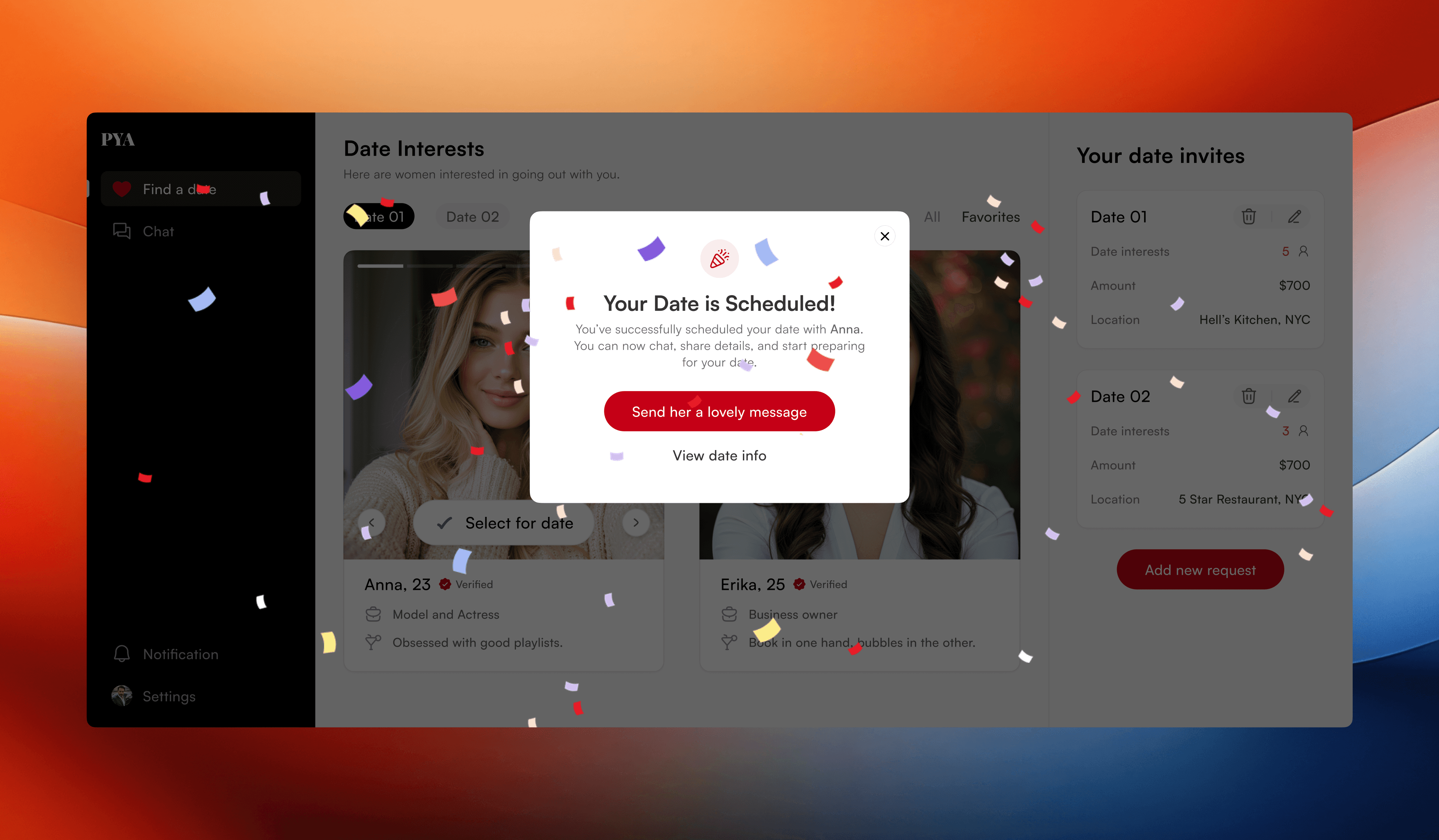 Men can create personalized date invites by selecting a venue, setting the date and time, and adding a thoughtful gift for their match.